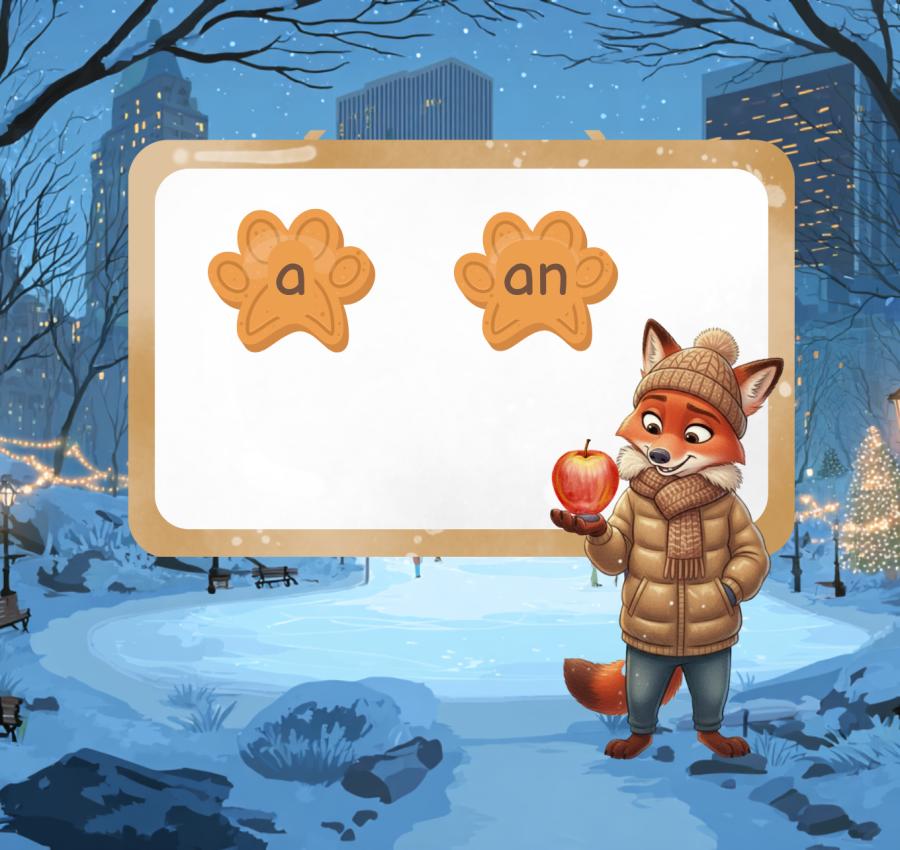 Learners choose the correct article using visual prompts, winter-themed cards, and interactive elements. Cute characters and a magical winter setting make grammar easy and enjoyable for young learners.
